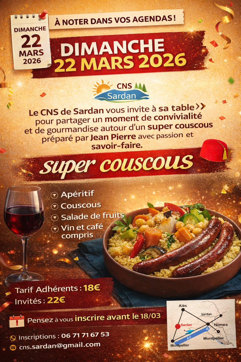 Le CNS de Sardan vous invite à sa table pour partager un moment de convivialité et de gourmandise autour d'un super couscous préparé par Jean Pierre avec passion et savoir-faire.